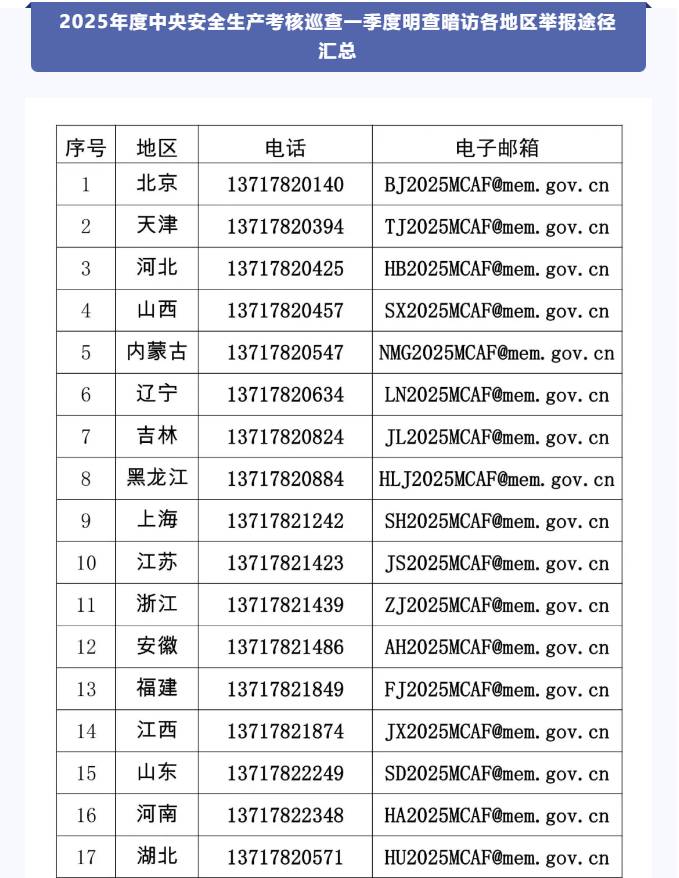 进驻期间,各考核巡查组将通过设立举报电话、电子邮箱等方式接收群众举报,坚决查处群众身边的安全生产重大问题隐患,对典型重大问题,将提级督办并移交属地倒查责任。